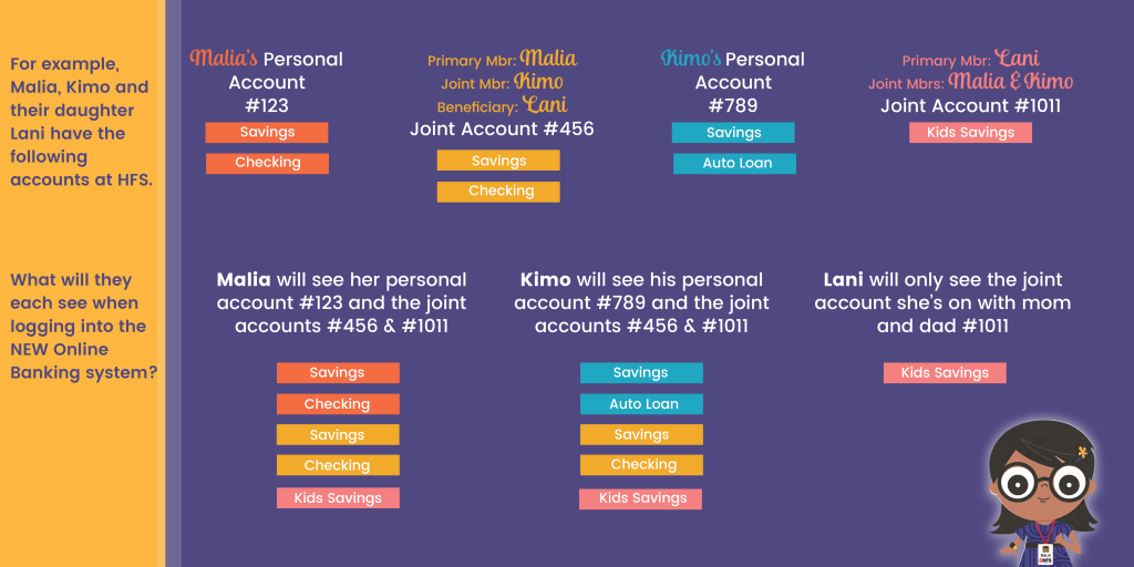 Now, some of you may be thinking “well, wait a minute, I don’t want the joint owner on my account to see my account activity”. Or maybe you are a joint owner on your kids accounts or another relative or family member, but you don’t necessarily access that account or need to see any of the account activity. This could also affect anyone that may share their login with others (though we don’t recommend this) now that the login is not specific to one account. If this new feature worries you for any of these reasons, let’s talk about some of the options you may have to make this an easy and comfortable transition. First, let’s go over a few different types of account relationships to help you decide what’s right for you.